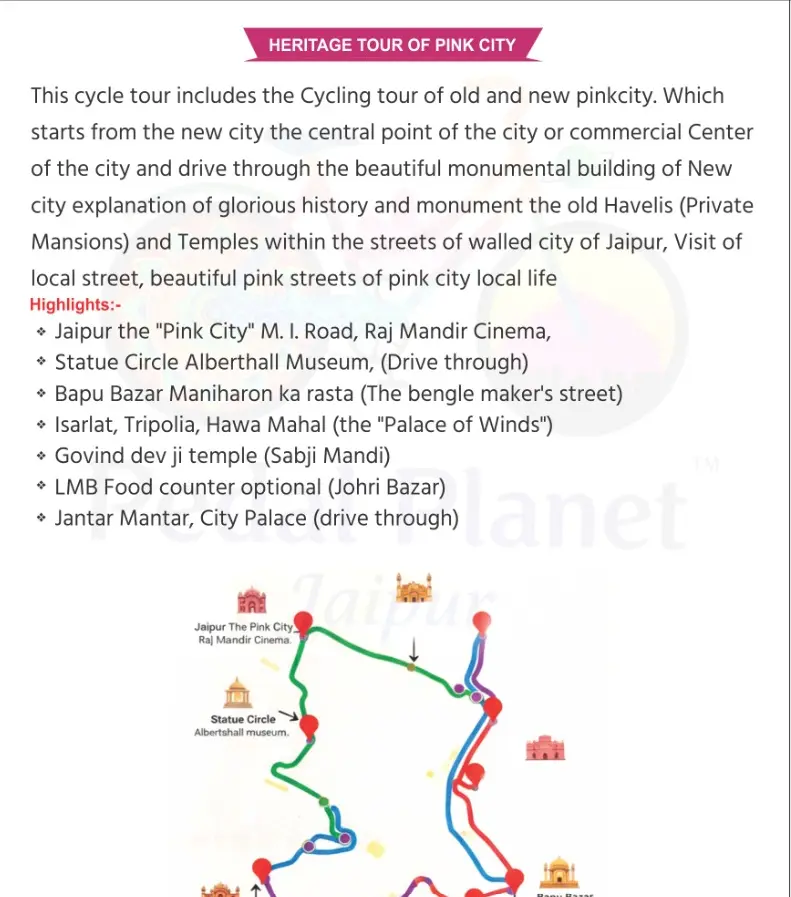 This cycle tour includes the Cycling tour of old and new pinkcity. Which starts from the new city the central point of the city or commercial Center of the city and drive through the beautiful monumental building of New city explanation of glorious history and monument the old Havelis (Private Mansions) and Temples within the streets of walled city of Jaipur, Visit of local street, beautiful pink streets of pink city local life